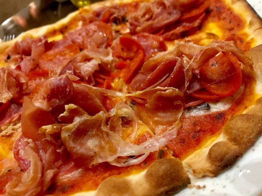 The next day, it really poured! We had wanted to explore the resort some more (like the water park they have), but decided to stay in because it was really raining hard and did so for most of the day. We spent a lot of the time in the hotel room, ordering room service, working on our laptops, watching movies and just hanging out and relaxing. I loved being able to order room service whenever we got hungry. Their pasta was so yummy! For our last dinner on the property, we decided to go Italian and eat at Tavola. It was our favorite restaurant on the property! We ordered Florentine Salad and Caprese Salad to start off with and they were delicious! And for dinner, Frank ordered the Roberta Pizza with salami, pepperoni, Italian sausage and fresh prosciutto and I ordered the Riggatoni 4 Formaggio – a pasta with a white cream sauce and four cheeses. It was really rich and yummy! For dessert, we ordered the Fresh Baked Chocolate Chip Cookie  topped with Vanilla Ice Cream and Chocolate Sauce. Oh my gosh – so decadent! My mouth is watering just writing about it and looking at the picture. This was a really good restaurant!