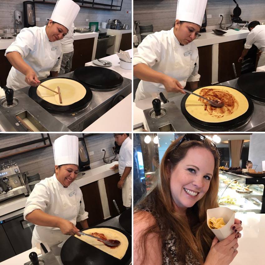For dinner, we decided to order room service and hang out in our gorgeous room. Let me tell you…the bed and pillows were so comfortable! I didn’t want to leave!!! The next morning, we had breakfast in the Grand Buffet and then headed to the coffee bar in the main building. There we ordered coffee (again included) and some delicious crepes. The crepes were so good! We had jam on ours.